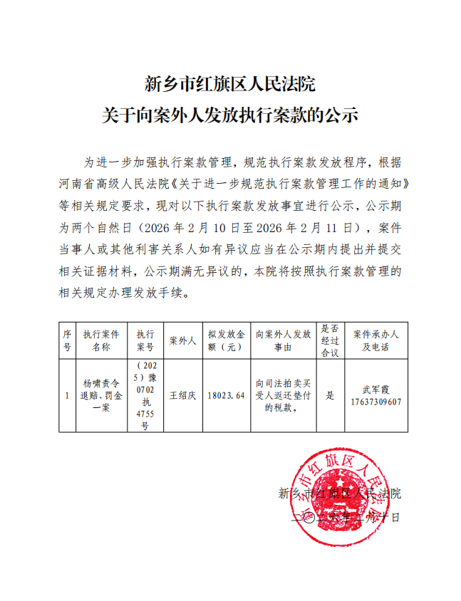 新乡市红旗区人民法院关于向案外人发放执行案款的公示