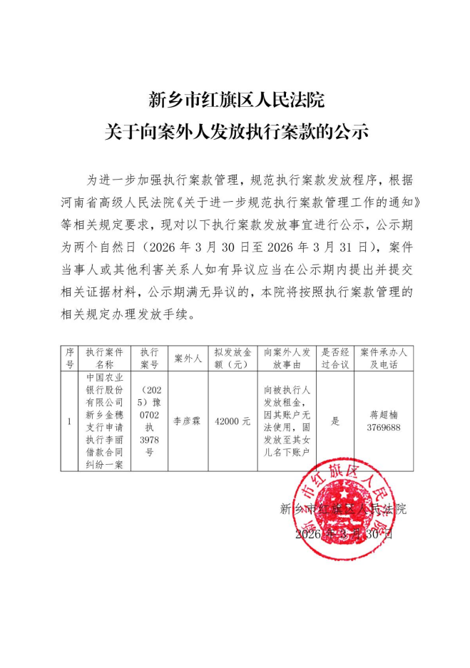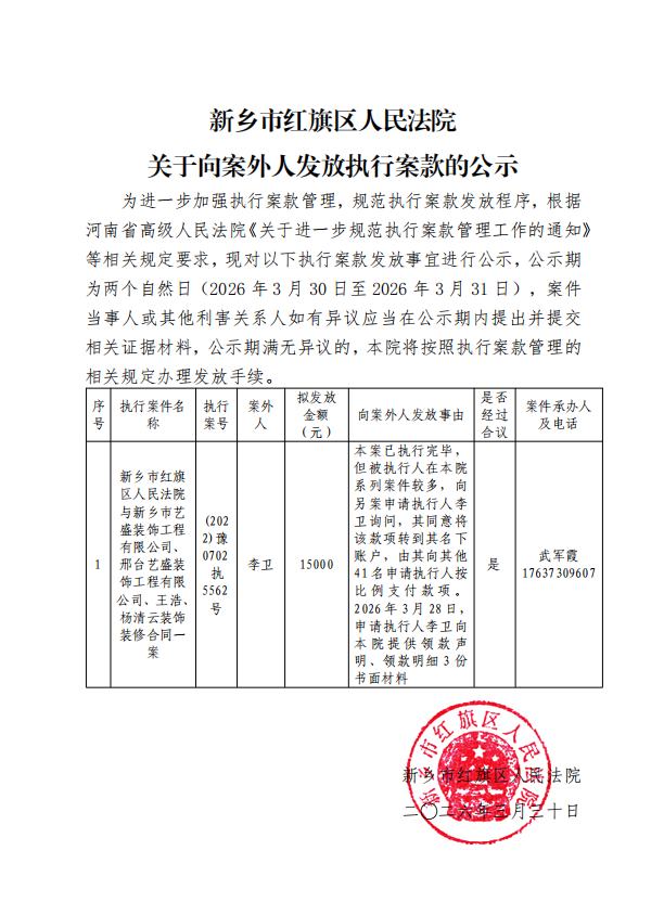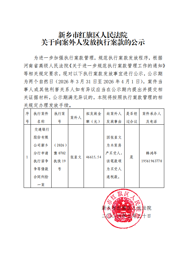 新乡市红旗区人民法院关于向案外人发放执行案款的公示